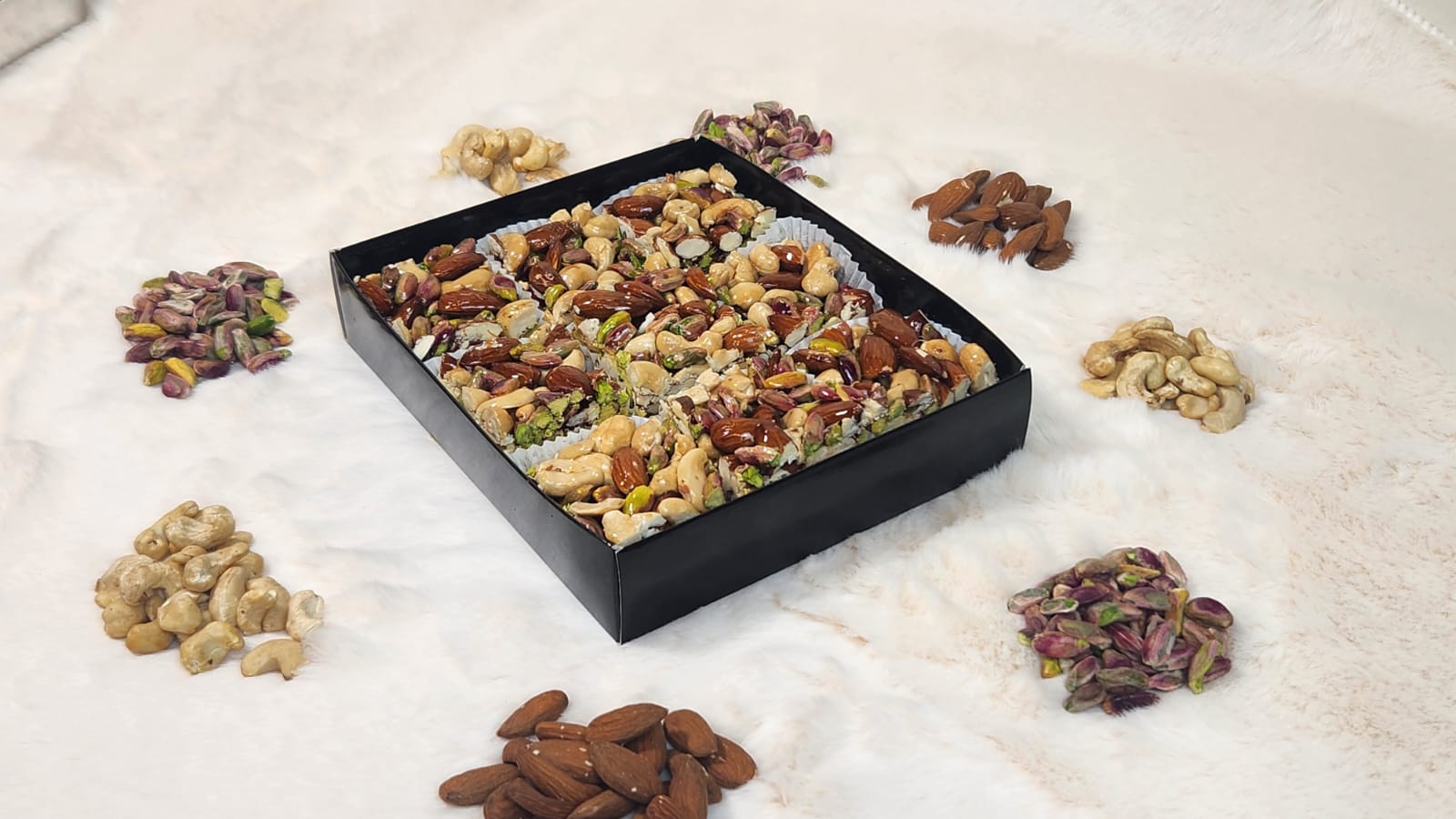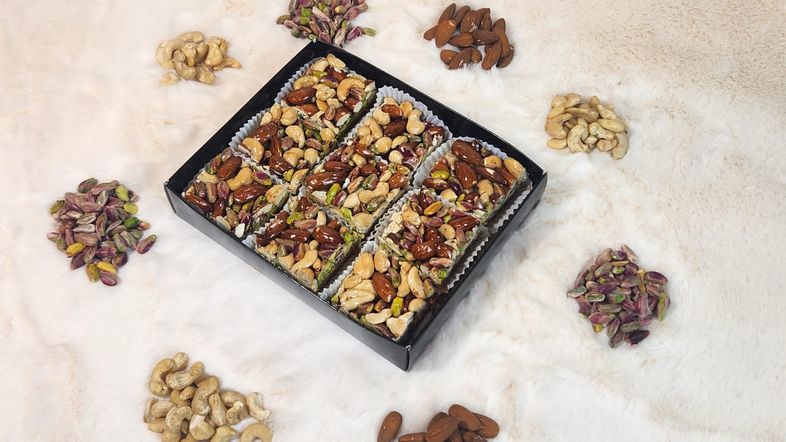 - Ingredients: Kunafa, almonds, cashews, pistachios.